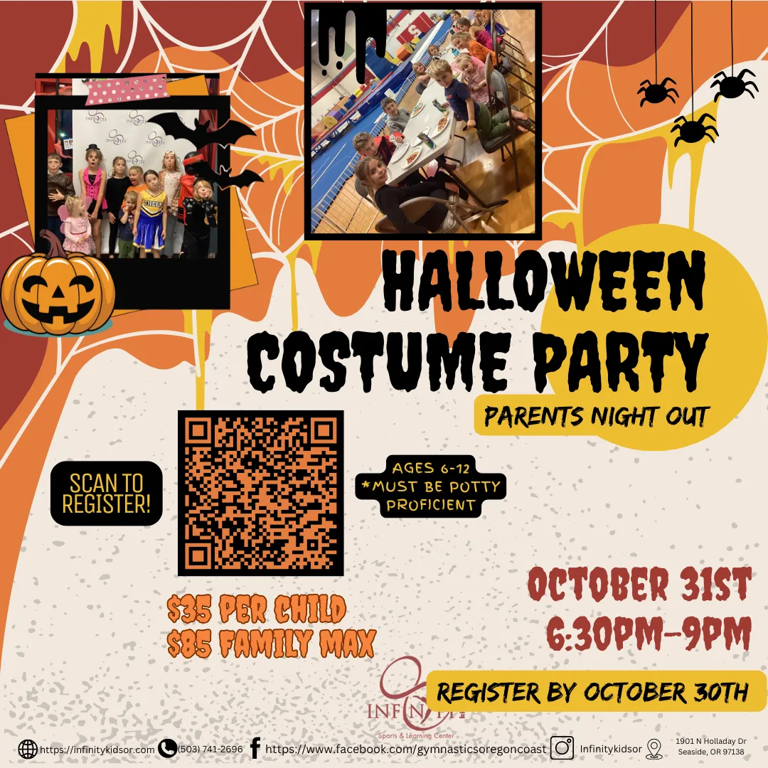 Looking for a spook-tacular night out? Drop the kids off at Infinity Kids for our Halloween Costume Party Parents Night Out filled with games, activities, and plenty of Halloween fun!